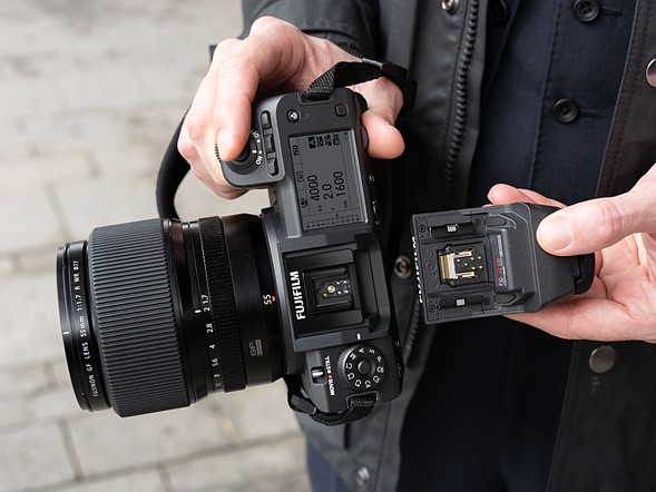 GFX 100 II 使用与该系列其他相机(例如 GFX 50S 和 GFX 100)相同的电子取景器插槽。如果您已经在系统中,这意味着您将能够使用 EVF-TL1 等配件来更改取景器的角度,或者在依靠后液晶显示屏时完全关闭它。