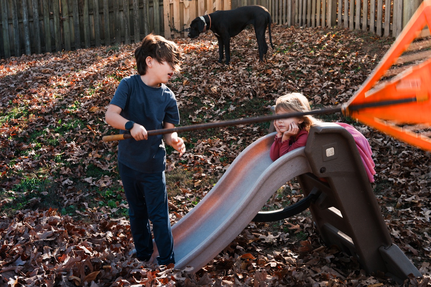 为了测试快门速度的极限,我给孩子们拍了些照片来检查图像畸变情况。结果令人印象深刻。即使是我儿子挥动耙子的照片,耙子看起来也很直,没有出现果冻畸变,尽管我的快门速度是 1/250 秒,画面出现了一些运动模糊。
